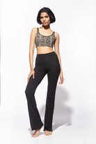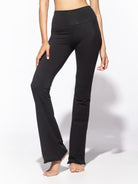 Diese schwarzen High-Waist-Schlaghosen sind in zwei verschiedenen Materialien erhältlich: in der mitteldicken Baumwolle, wie bei all unseren engen Leggings, oder in der dickeren Baumwolle, wie bei unseren bedruckten Schlaghosen.