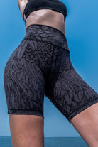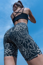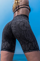 Super comfy high waisted bikershorts, our hotpants with a longer leg. Made in the Grey Black Feather printed cotton stretch material.
