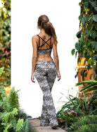 Model wears it on top of cream leopard yoga 3/4 leggings and on our cream leopard flares. Also available in many other prints and in plain colors and in a long version, the cross-back yoga top.