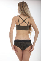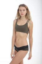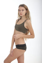 Our model wears size XS together with the olive-green cross-back bra also in size XS.