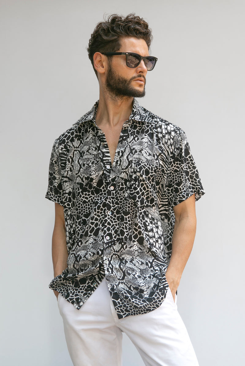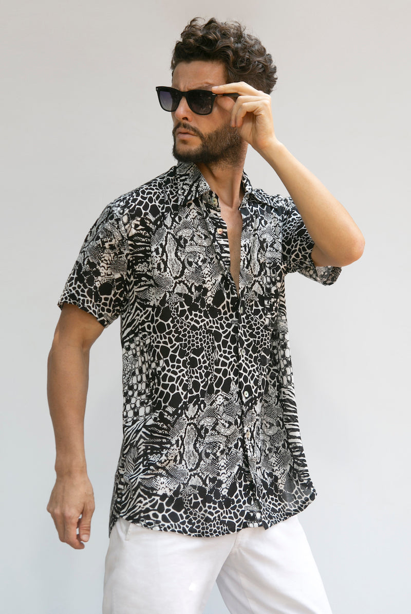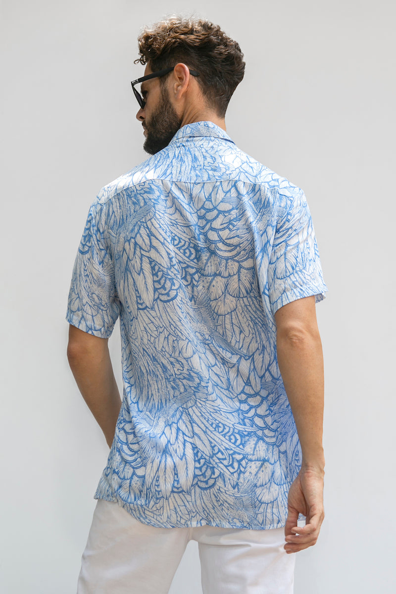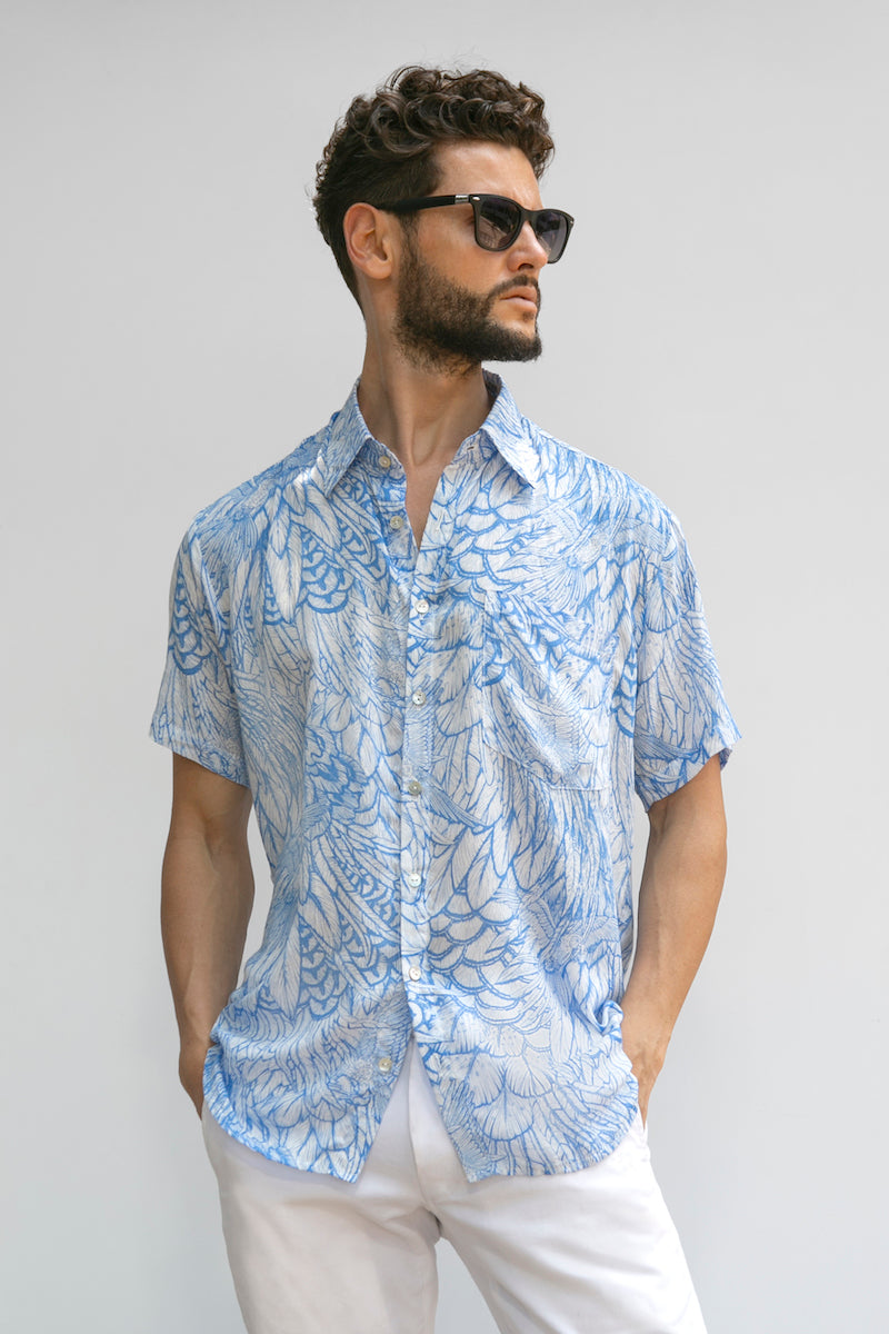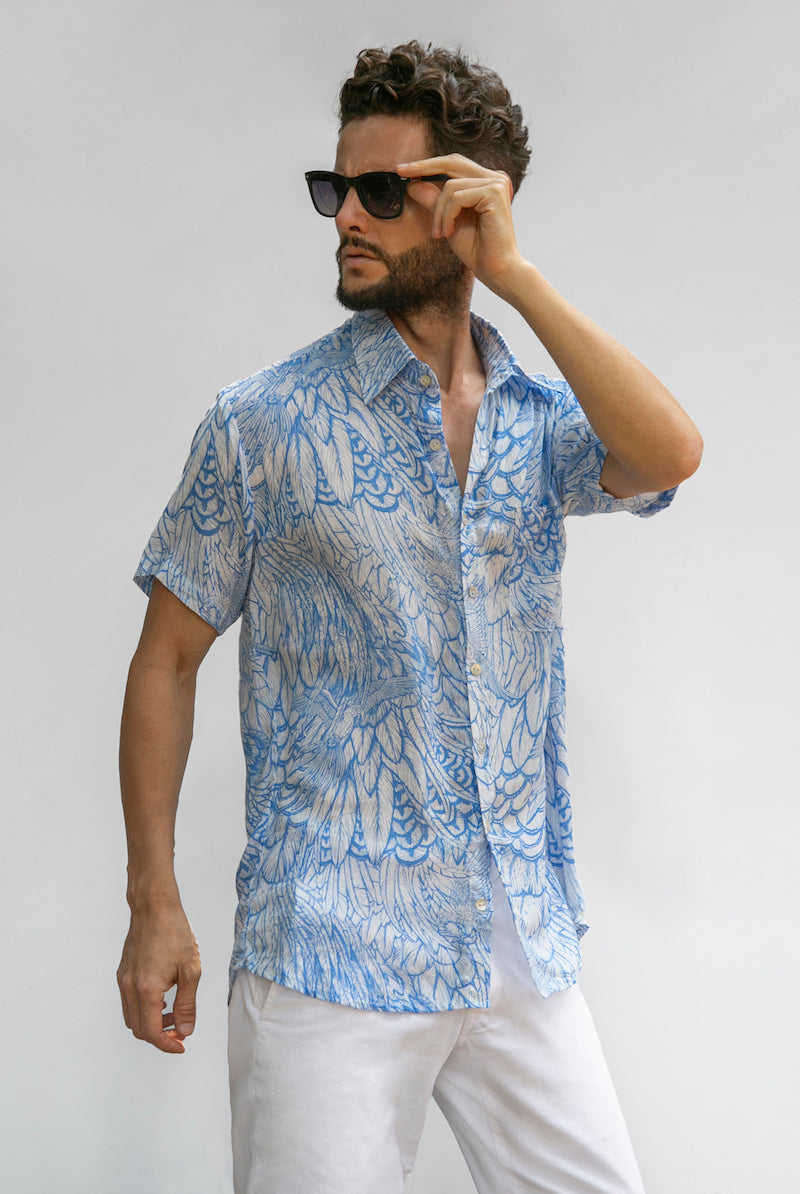 Finally a shirt for men in our amazing rayon voile material. Soft, flowy, light and super comfortable. Stays beautiful no matter how many times you wash it, no pilling. High quality and with our gorgeous Feather print in blue.